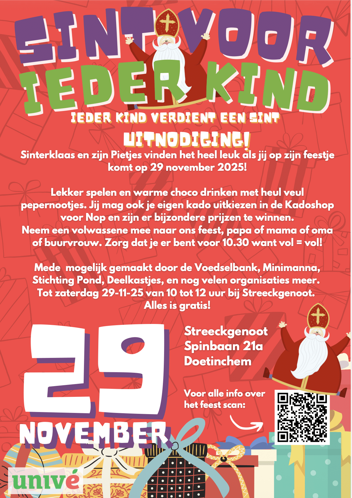 Op 29 november van 10:00 tot 12:00 zijn alle uitgenodigde kinderen welkom bij Streeckgenoot in Doetinchem, waar een ochtend vol vrolijkheid en verrassingen op hen wacht. Kinderen kunnen Sinterklaas en zijn pieten ontmoeten, meedoen aan leuke activiteiten, genieten van heerlijke traktaties en samen spelen met andere kinderen. Het hoogtepunt van de dag? Elk kind mag zelf een cadeau uitzoeken om mee naar huis te nemen – een speciaal geschenk van Sinterklaas zelf!