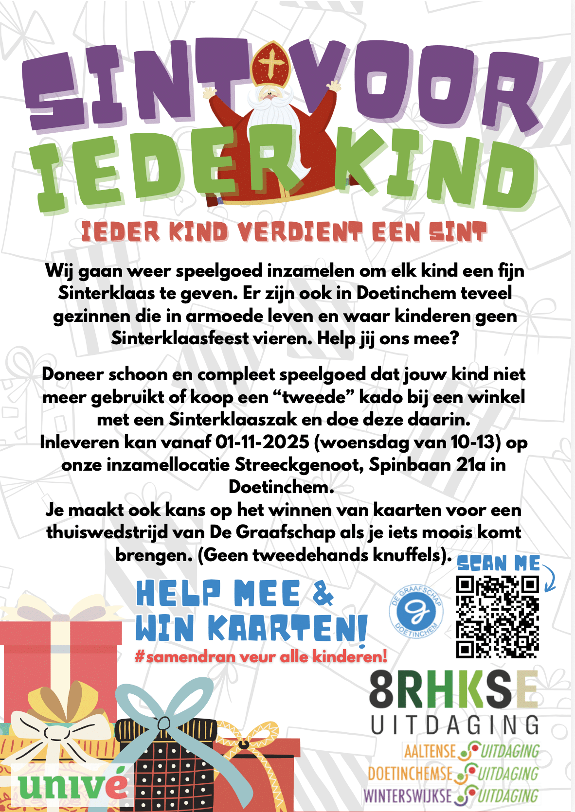 Om deze dag mogelijk te maken, zamelen we schoon en compleet speelgoed in. Dit speelgoed wordt met zorg geselecteerd, zodat elk kind een passend cadeau krijgt. Wil jij bijdragen aan dit prachtige initiatief? Doneer dan speelgoed dat je niet meer gebruikt, of help ons door een nieuw cadeautje te geven. Je kunt het speelgoed inleveren bij een van onze inzamelpunten in de winkels (herkenbaar aan de juten zakken) of bij de inzamelmomenten bij Streeckgenoot, daarmee maak je kans op kaarten voor een thuiswedstrijd van De Graafschap!